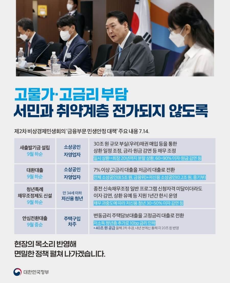 정부가 청년층의 재기 지원을 위한 채무조정 지원책과 서민과 저신용자에 대한 금융 지원 보완 대책을 내놓았다. 최근 물가 급등과 금리 상승의 여파로 소득에 비해 대출 비중이 높은 청년층의 어려움을 감안한 조치이다. 지난 7월 14일 정부는 윤석열 대통령 주재로 제2차 비상 경제 민생회의를 개최하고 이 같은 정책 지원안을 공개했다. 이 중 가장 주목을 받고 있는 청년 특례 채무조정 관련하여 지원 대상, 신청 기간 정보 포스팅을 해보고자 한다.