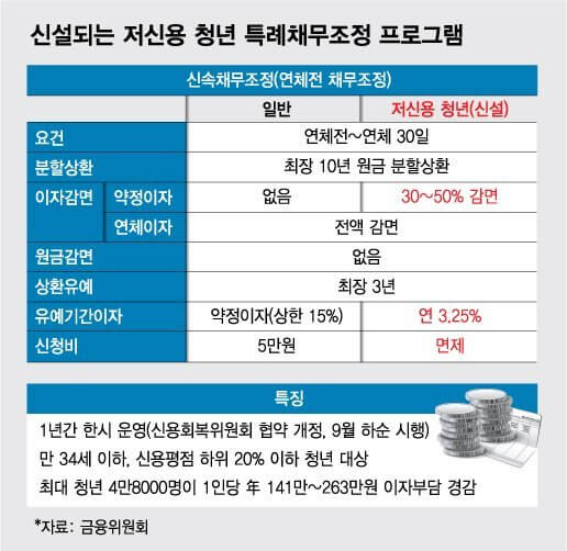 먼저 청년 이번에 신설된 청년 특례 채무조정이란 저신용 청년들의 재기와 재산 형성을 지원하기 위한 신용회복위원회의 청년 특례 프로그램으로 우선 9월 하순까지 신용회복위원회에 신속채무조정 특례 프로그램을 신설해 1년간 한시 운영되는 신속 채무조정 제도라고 할 수 있다. 기존 지원 제도에선 신청 자격이 미달되는 연체 발생 이전 채무자라도 이자 감면, 상환 유예 등의 채무조정 프로그램을 지원한다. 대상에 선정되면 소득, 재산을 고려한 채무 과중 중도에 따라 이자를 30~50% 감면받을 수 있다. 연 10% 수준의 금리는 5~7% 수준으로 낮아지게 되는 셈이다. 최대 3년간 원금 상환 유예를 해주며 이 기간 연 3.25%의 낮은 이자율을 부과한다.  이 청년 특례  채무조정으로 최대 4만 8천 명의 청년이 1인당 1년에 141만 원에서 263만 원까지 이자 부담의 경감 효과를 볼 수 있을 것이라 기대된다.